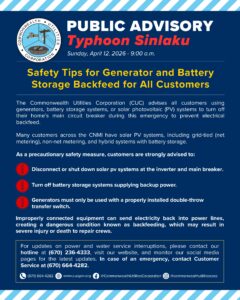 Public Advisories 2026-04-12 Public Advisory re Safety Tips for Generator and Battery Storage Backfeed for All Customers Read More April 12, 2026