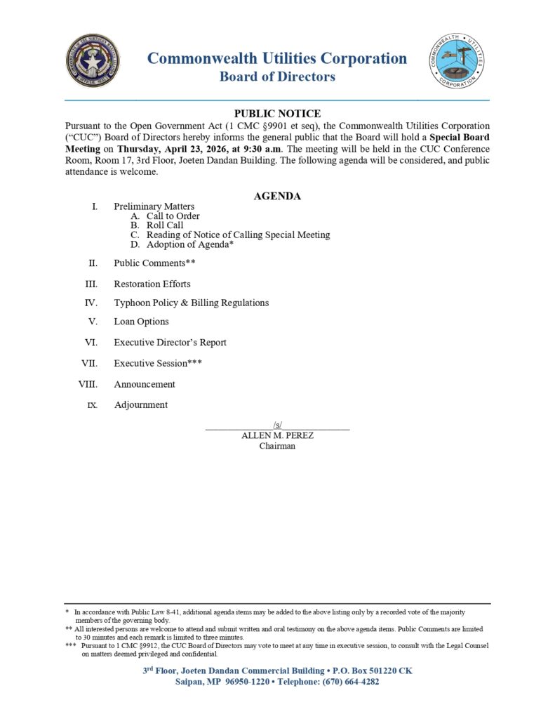 Home » News and Events » Board Meeting Agendas » 2026-04-23 CUC Special Board Meeting Agenda Notice