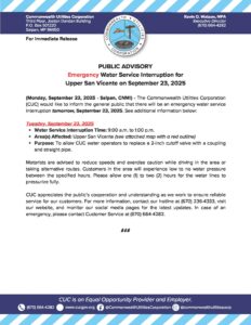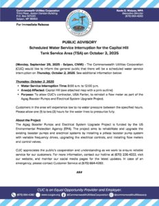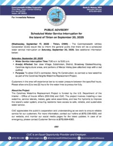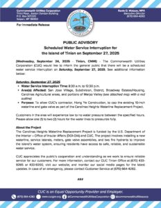 Public Advisories 2025-09-17 Public Advisory re Scheduled Water Service Interruption for the Island of Tinian on September 20, 2025 Read More September 18, 2025