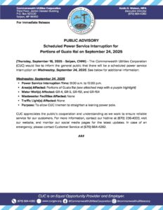 Public Advisories 2025-09-18 Public Advisory re Scheduled Power Service Interruption for Portions of Gualo Rai on September 24, 2025 Read More September 18, 2025