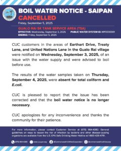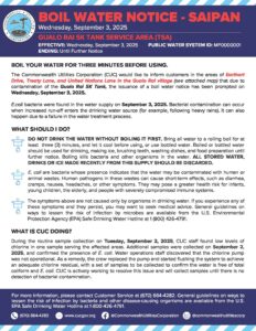 Public Advisories 2025-09-03 Boil Water Notice re Gualo Rai 5K Tank Service Area, Saipan Read More September 4, 2025