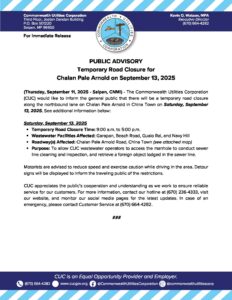 Public Advisories 2025-09-11 Public Advisory re Temporary Road Closure for Chalan Pale Arnold on September 13, 2025 Read More September 11, 2025
