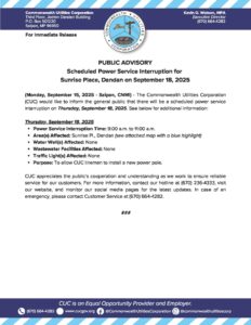 Public Advisories 2025-09-16 Press Release Re CUC Hosts Pre-Proposal Conference for the IPP – Solar PV with BESS for All Islands, CNMI Read More September 16, 2025