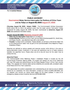 Public Advisories 2025-08-26 Public Advisory re Rescheduled Water Service Interruption for Portions of China Town and As Falipe on August 27, 2025 Read More August 26, 2025