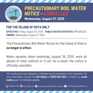 Public Advisories 2025-08-31 Public Advisory re Emergency Water Service Interruption for the Island of Rota Today, August 31, 2025 Read More August 31, 2025