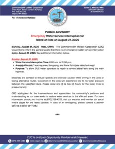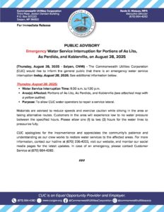 Public Advisories 2025-08-28 Public Advisory re Emergency Water Service Interruption for Portions of As Lito, As Perdido, and Koblerville on August 28, 2025 Read More August 28, 2025