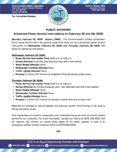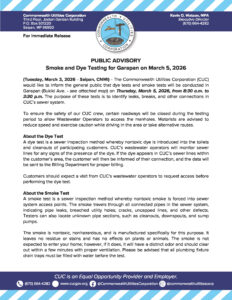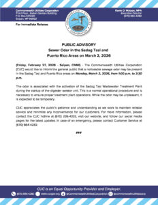 Public Advisories 2026-03-03 Public Advisory re Smoke and Dye Testing for Garapan on March 5, 2026 Read More March 3, 2026