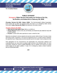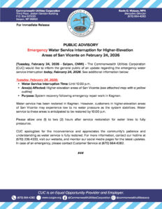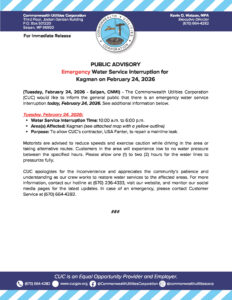 Public Advisories 2026-02-24 Public Advisory re Emergency Water Service Interruption for Kagman on February 24, 2026 Read More February 24, 2026