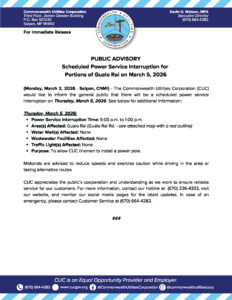 Public Advisories 2026-03-02 Public Advisory re Scheduled Power Service Interruption for Portions of Gualo Rai on March 5, 2026 Read More March 2, 2026