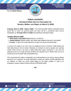 Public Advisories 2026-02-26 Public Advisory re Emergency Water Service Interruption for Portions of As Lito, As Perdido, and Koblerville Today, February 26, 2026 Read More February 27, 2026