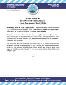 Public Advisories 2026-03-04 Public Advisory re Sewer Odor in the Sadog Tasi and Puerto Rico Areas on March 9, 2026 Read More March 4, 2026