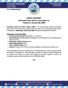 Public Advisories 2026-01-22 Public Advisory re Scheduled Power Service Interruption for Talafofo on January 28, 2026 Read More January 22, 2026