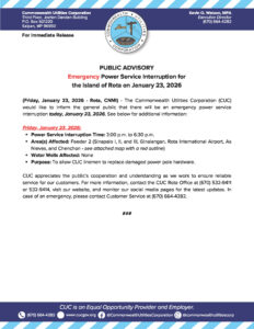 Public Advisories 2026-01-23 Public Advisory re Emergency Power Service Interruption for the Island of Rota Today, January 23, 2026 Read More January 23, 2026