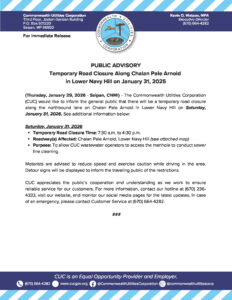 Public Advisories 2026-01-29 Public Advisory re Temporary Road Closure Along Chalan Pale Arnold in Lower Navy Hill on January 31, 2026 Read More January 29, 2026