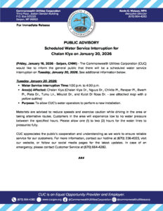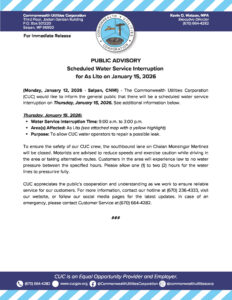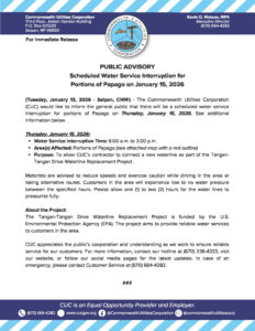 Public Advisories 2026-01-16 Public Advisory re Scheduled Water Service Interruption for Chalan Kiya on January 20, 2026 Read More January 16, 2026