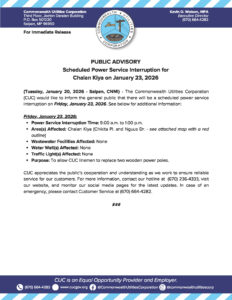 Public Advisories 2026-01-20 Public Advisory re Scheduled Power Service Interruption for Chalan Kiya on January 23, 2026 Read More January 20, 2026