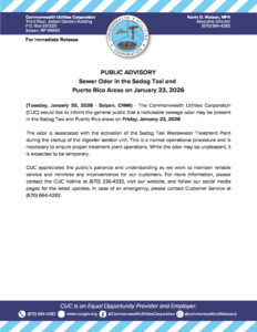 Public Advisories 2026-01-20 Public Advisory re Sewer Odor in the Sadog Tasi and Puerto Rico Areas on January 23, 2026 Read More January 20, 2026