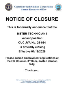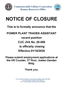 Public Advisories NOTICE – POWER PLANT TRADES ASSISTANT, Tinian Power Generation 01.16.2026 Read More January 12, 2026