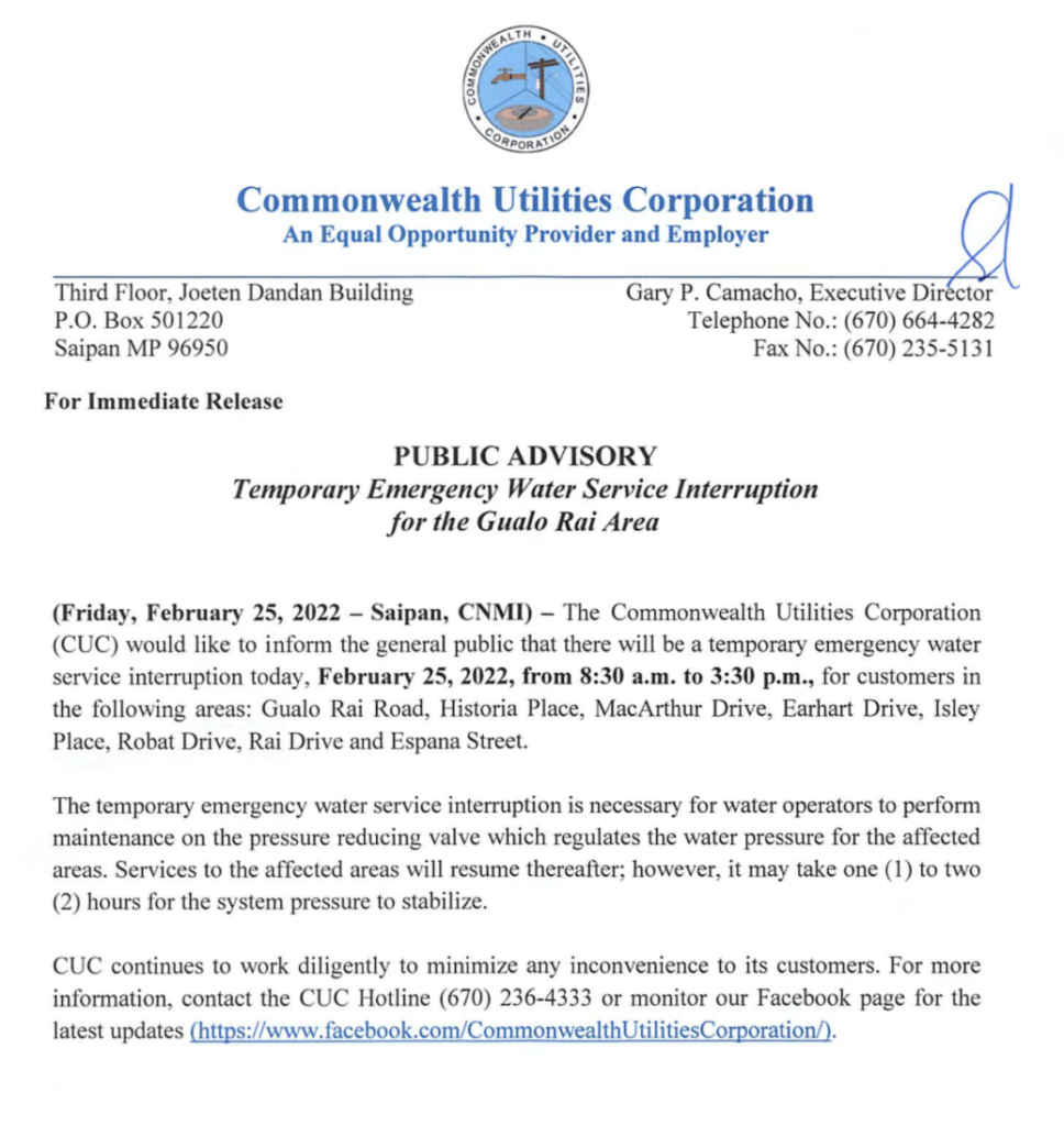 2022-FEB-25, Public Advisory re Temporary Emergency Water Service Interruption for the Gualo Rai Area