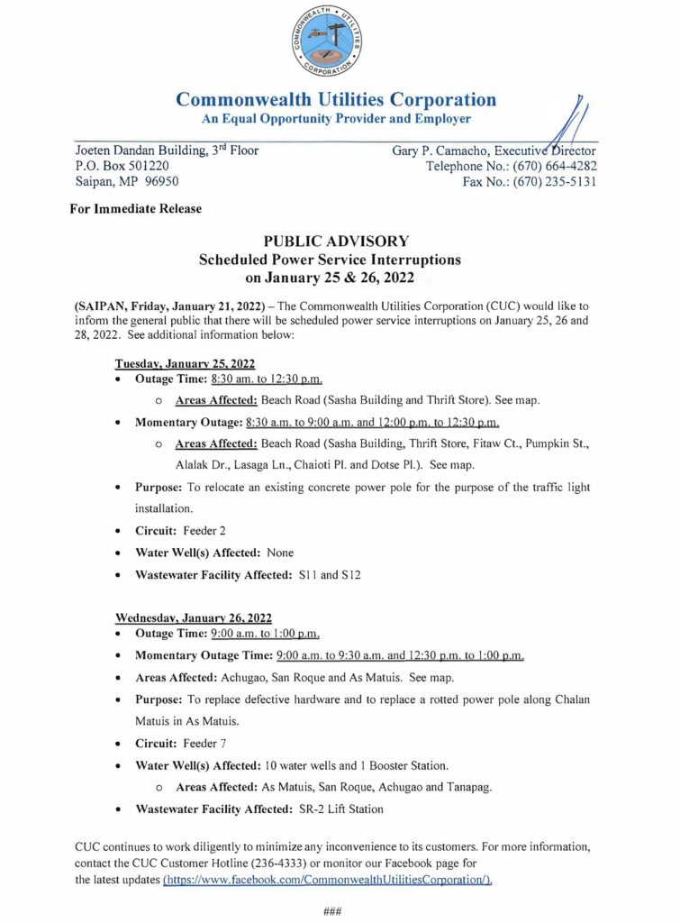 2022- JAN-21, Public Advisory re Scheduled Power Service Interruption on January 25 and 26, 2022