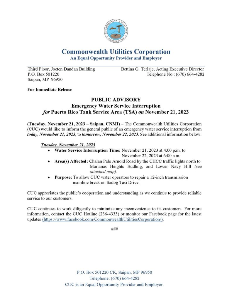 2023-11-21 Public Advisory re Emergency Water Service Interruption for Puerto Rico Tank Service Area (TSA)