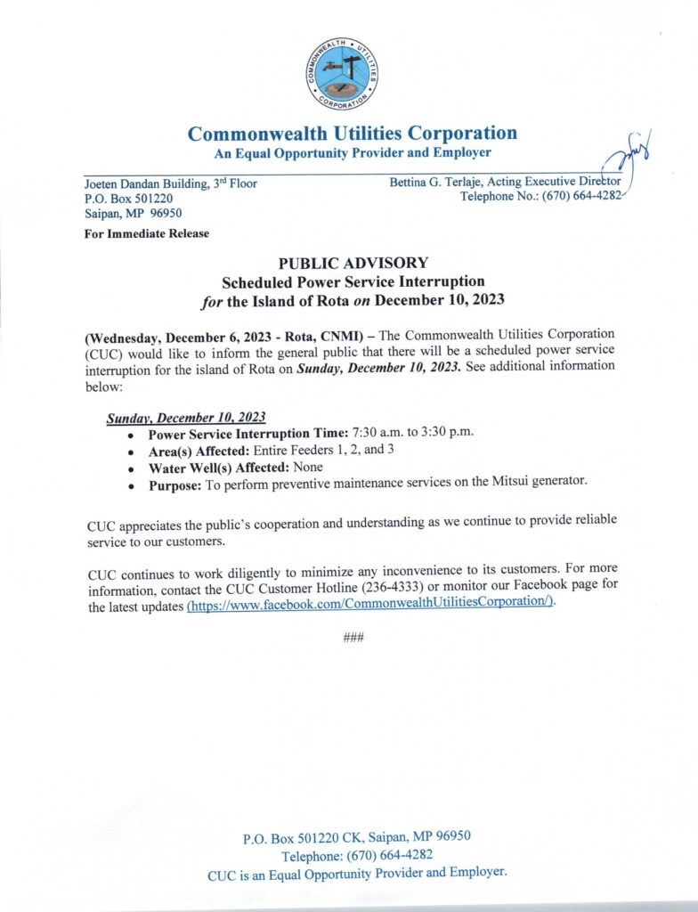 2023-12-6 Public Advisory re Power Service Interruption for the Island of Rota