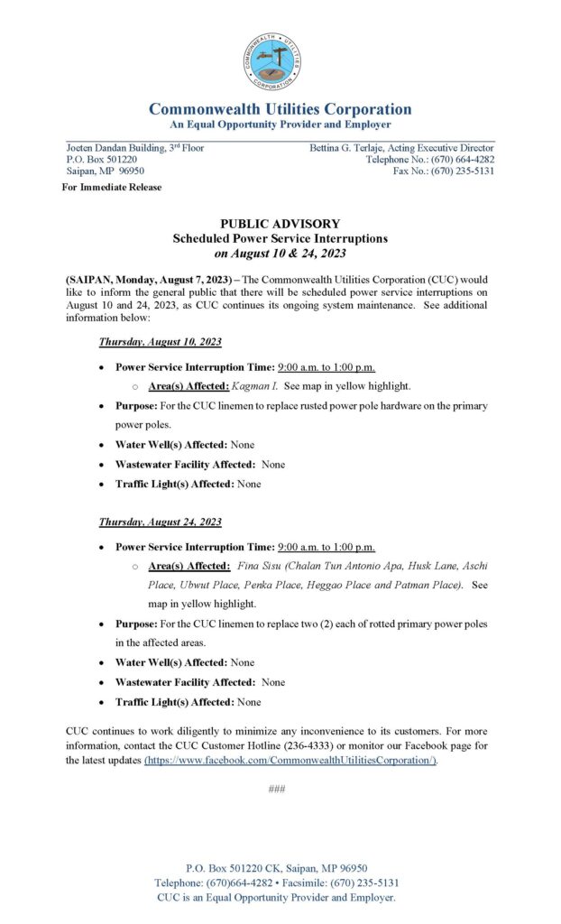 2023-AUG-07, Scheduled Power Service Interruption on August 10 and 24, 2023