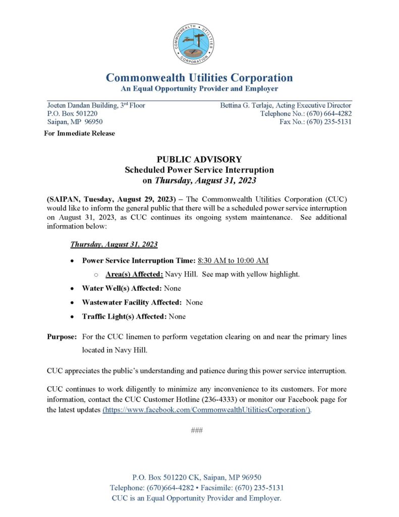 Home » News and Events » Public Advisories » 2023-AUG-29, Public Advisory re Scheduled Power Service Interruption on August 31, 2023