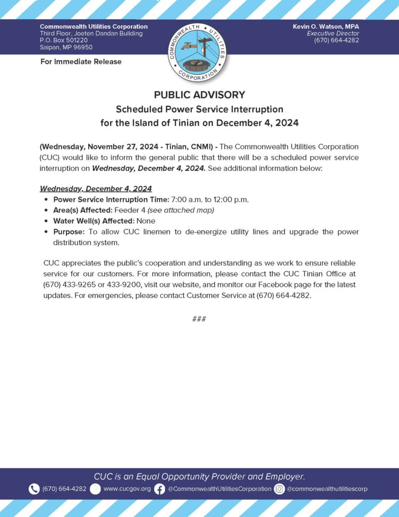 Home » News and Events » Public Advisories » 2024-11-27 Public Advisory re Scheduled Power Service Interruption for the Island of Tinian on December 4, 2024
