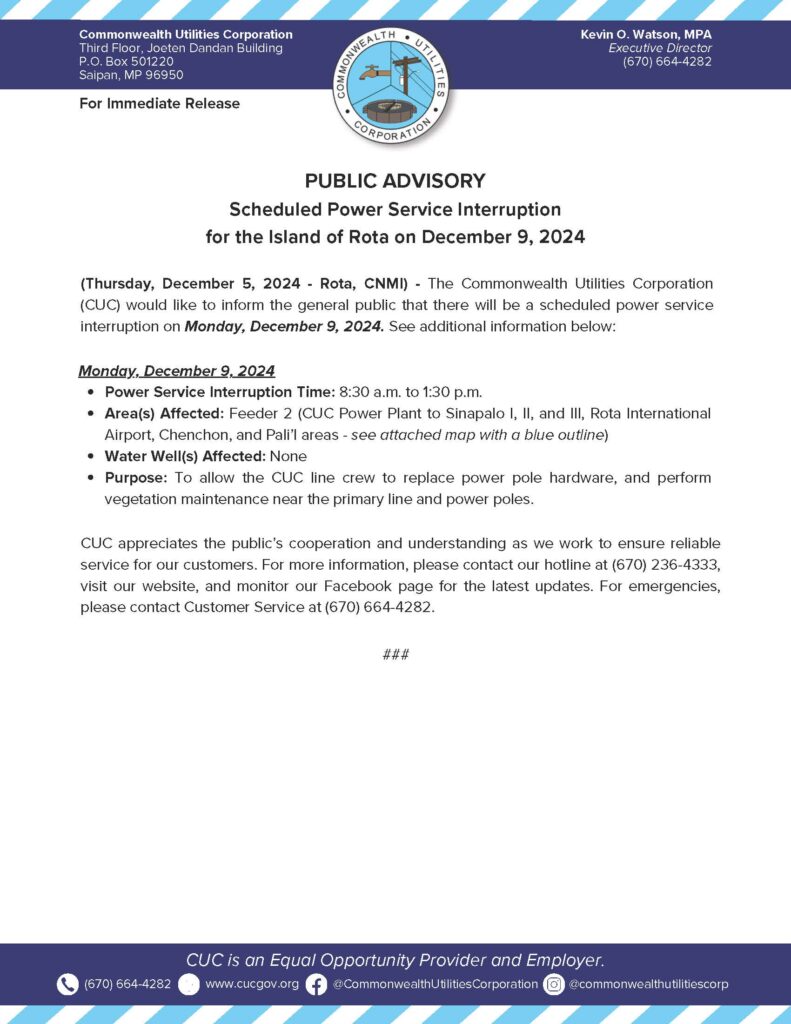 2024-12-05 Public Advisory re Scheduled Power Service Interruption for Rota on Dec. 9, 2024