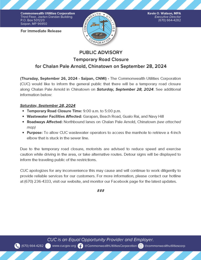 2024-9-26 Public Advisory re Temporary Road Closure for Chalan Pale Arnold, Chinatown on September 28, 2024