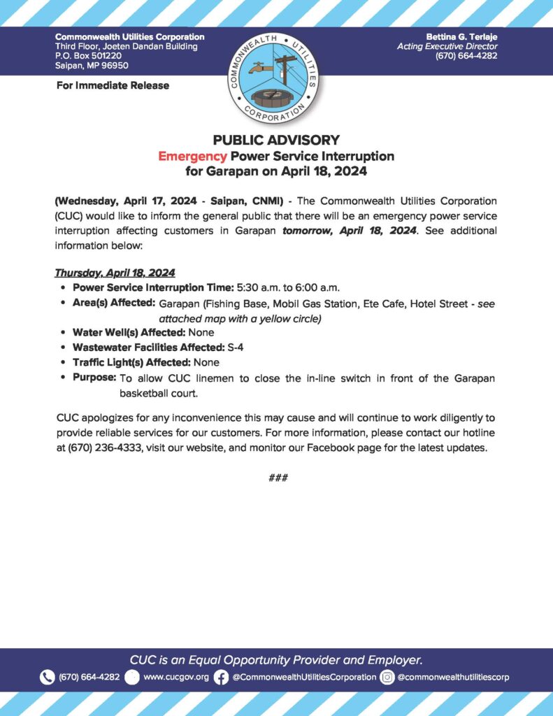 Home » News and Events » Public Advisories » 2024-April-17 Public Advisory re Emergency Power Service Interruption for Garapan on April 18, 2024