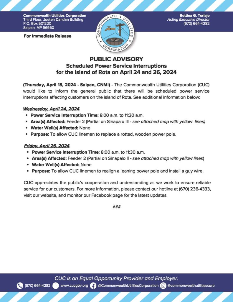 Home » News and Events » Public Advisories » 2024-April-18 Public Advisory re Scheduled Power Service Interruptions for the Island of Rota on April 24 and 26, 2024