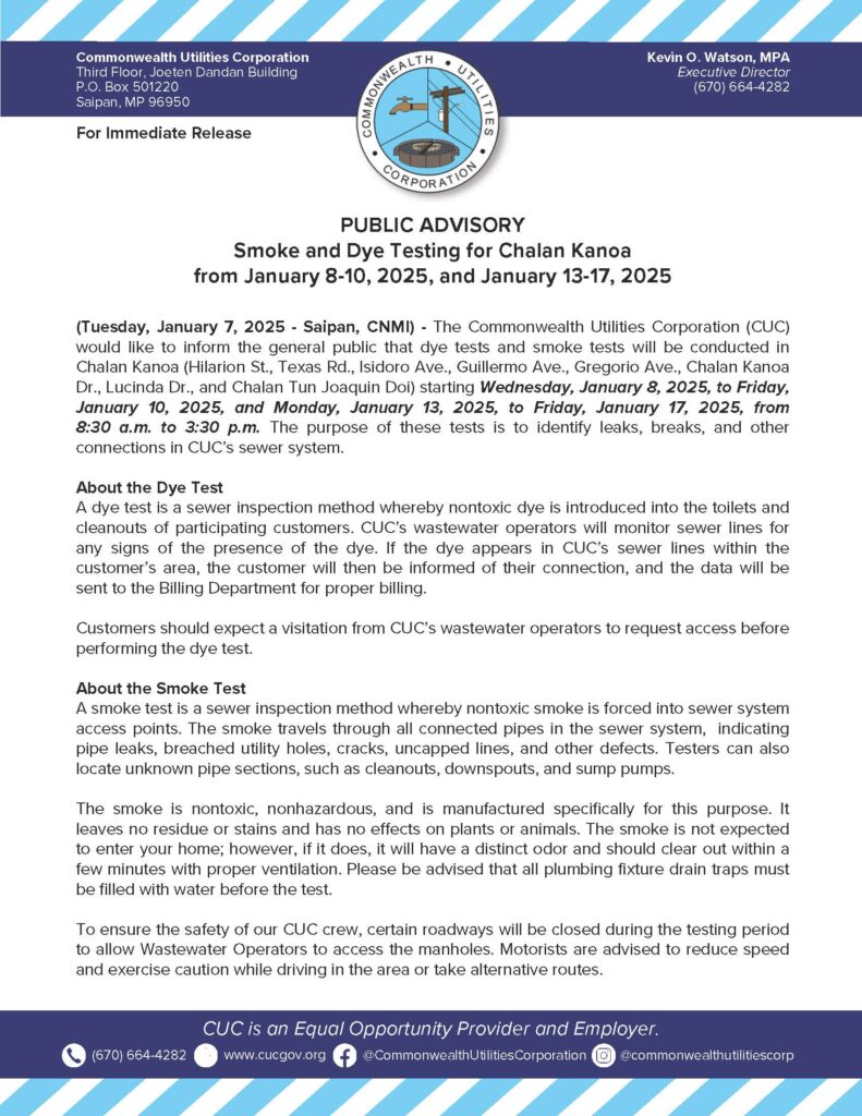 2025-01-07 Public Advisory re Smoke and Dye Testing for Chalan Kanoa from Jan. 8-20, 2025, & Jan. 13-17, 2025