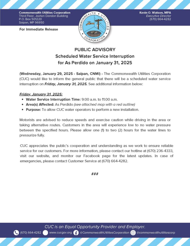 Home » News and Events » Public Advisories » 2025-01-29 Public Advisory re Scheduled Water Service Interruption for As Perdido on January 31, 2025