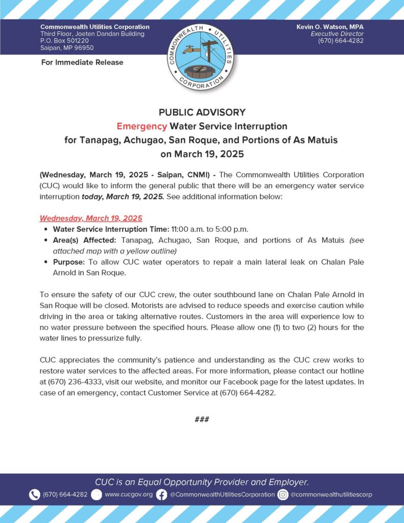 2025-03-19 Public Advisory re Emergency Water Service Interruption for Tanapag, Achugao, San Roque, and Portions of As Matuis Today, March 19, 2025
