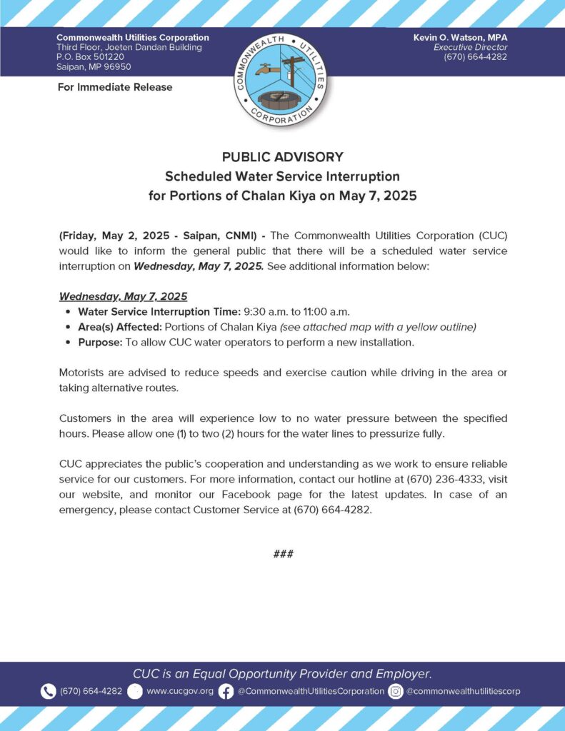 Home » News and Events » Public Advisories » 2025-05-02 Public Advisory re Scheduled Water Service Interruption for Portions of Chalan Kiya on May 7, 2025