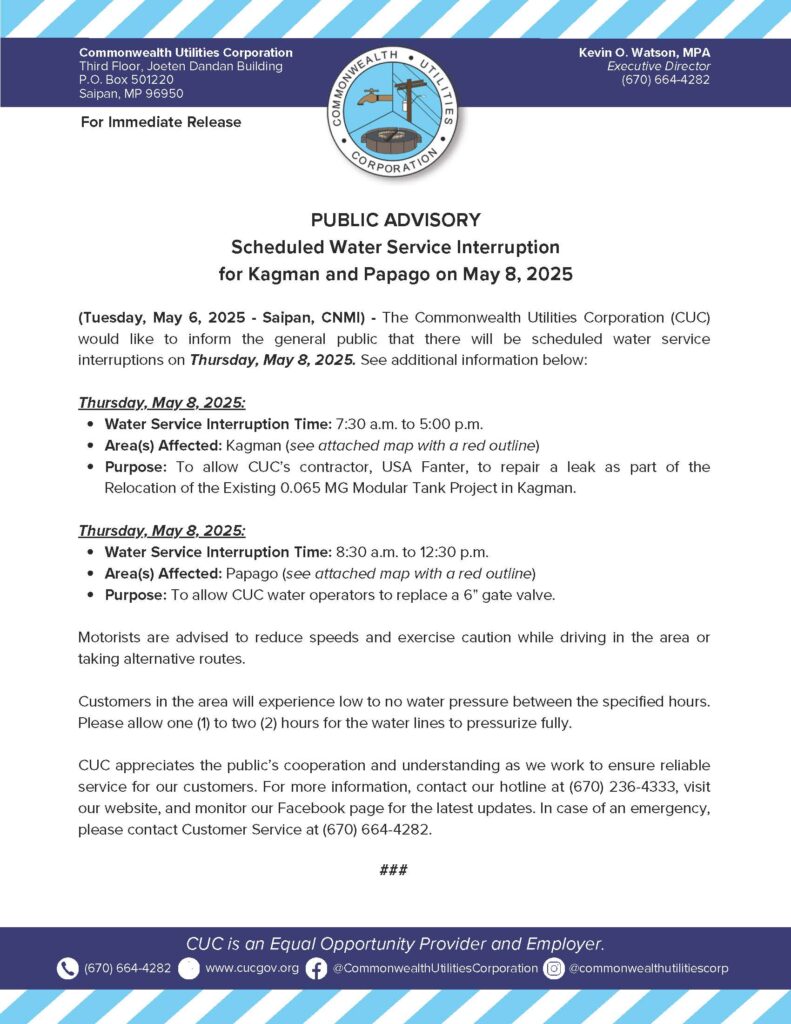 2025-05-08 Public Advisory re Scheduled Water Service Interruption for Kagman and Papago on May 8, 2025