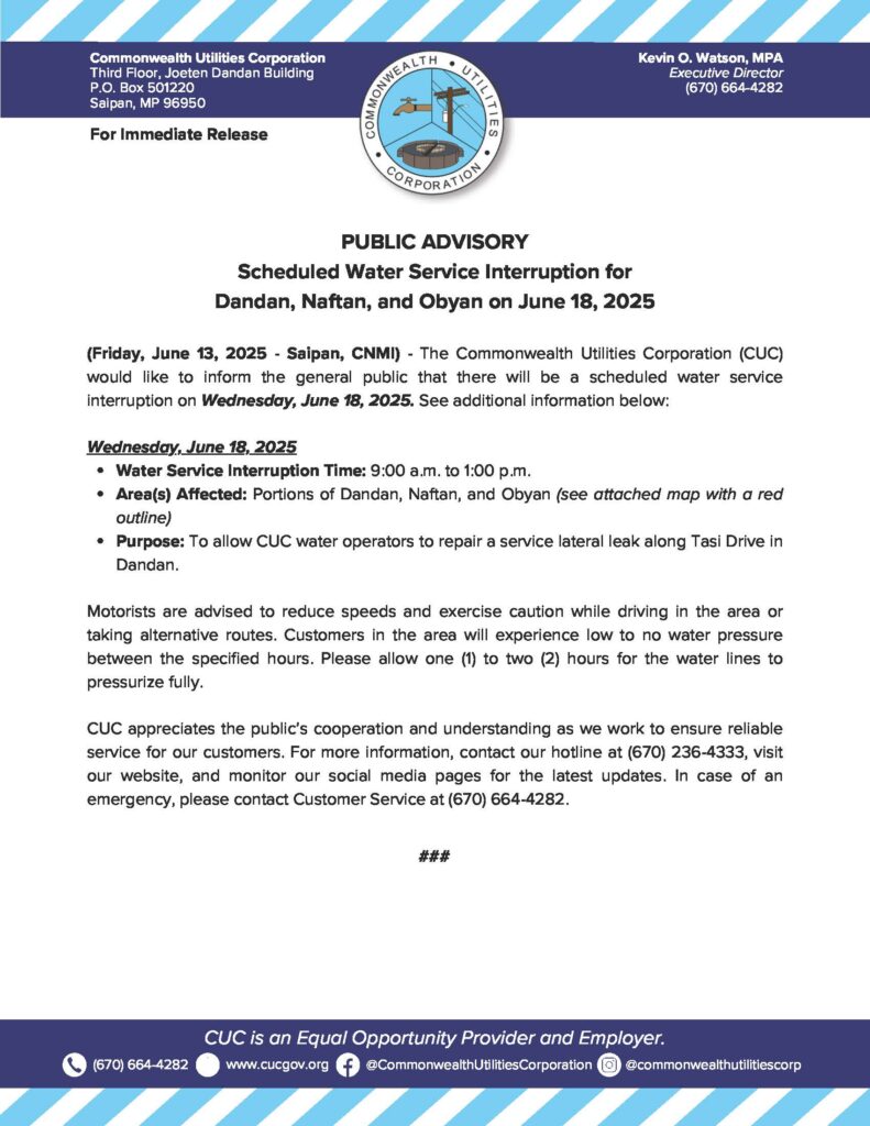 2025-06-13 Public Advisory re Scheduled Water Service Interruption for Dandan, Naftan, and Obyan on June 18, 2025