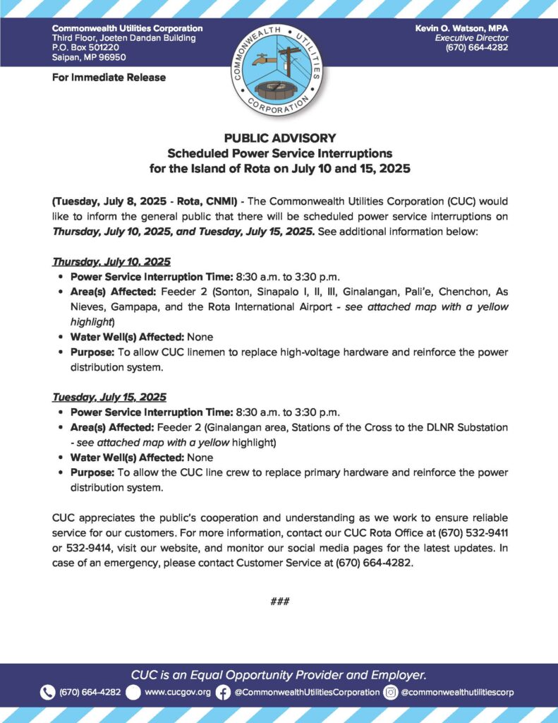 2025-07-08 Public Advisory re Scheduled Power Service Interruption for the Island of Rota on July 10 and 15, 2025