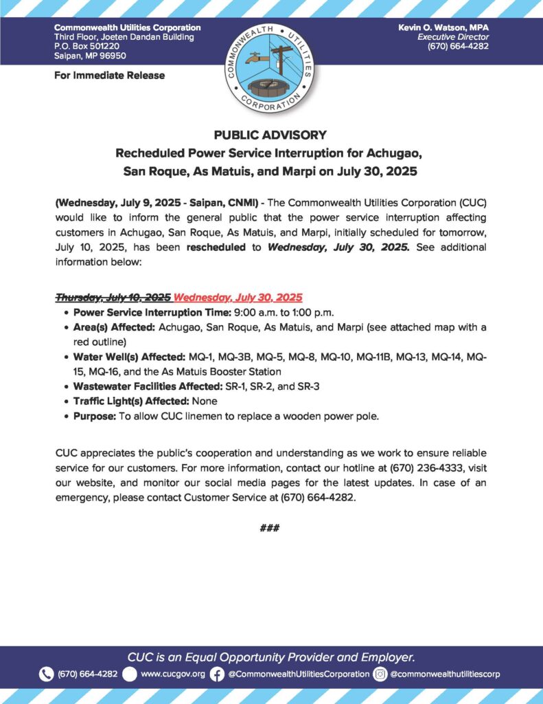 2025-07-09 Public Advisory re Rescheduled Power Service Interruption for Achugao, San Roque, and Marpi on July 30, 2025
