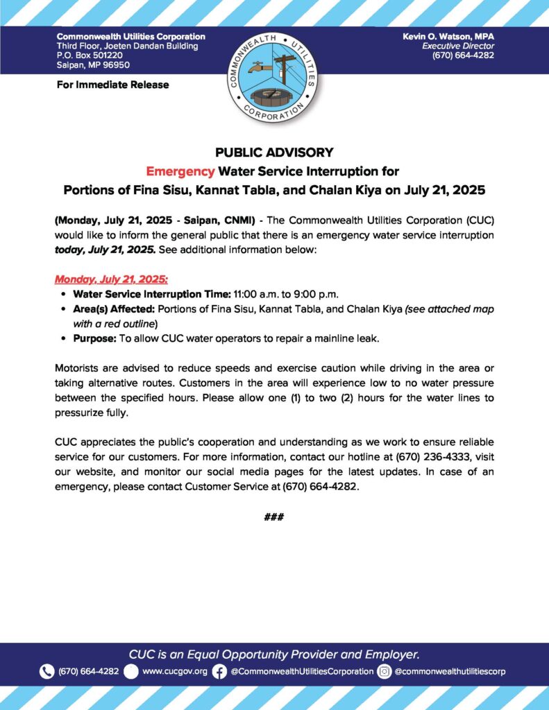 Home » News and Events » Public Advisories » 2025-07-21 Public Advisory re Emergency Water Service Interruption for Portions of Fina Sisu, Kannat Tabla, and Chalan Kiya Today, July 21, 2025