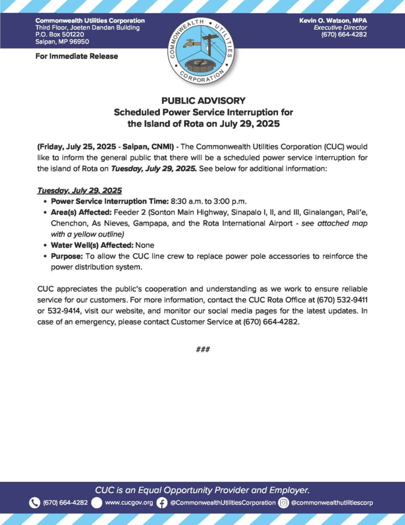 Home » News and Events » Public Advisories » 2025-07-25 Public Advisory re Scheduled Power Service Interruption for the Island of Rota on July 29, 2025