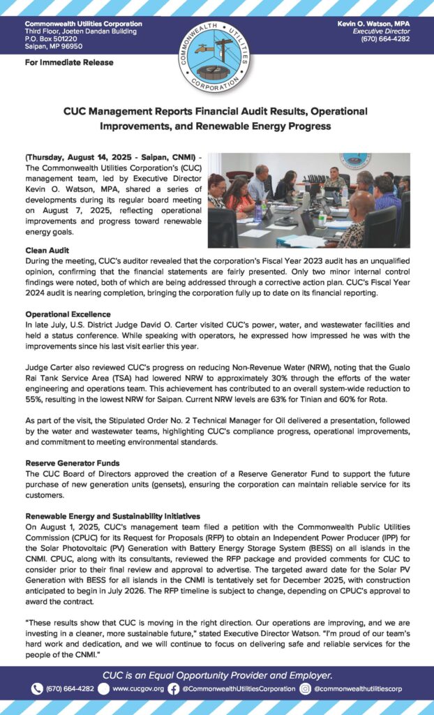 2025-08-14 Press Release re CUC Management Reports Financial Audit Results, Operational Improvements, and Renewable Energy Progress