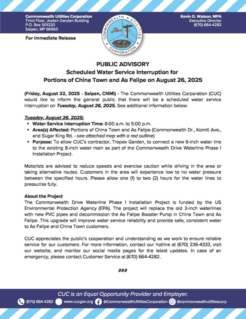2025-08-22 Public Advisory re Scheduled Water Service Interruption for Portions of China Town and As Falipe on August 26, 2025