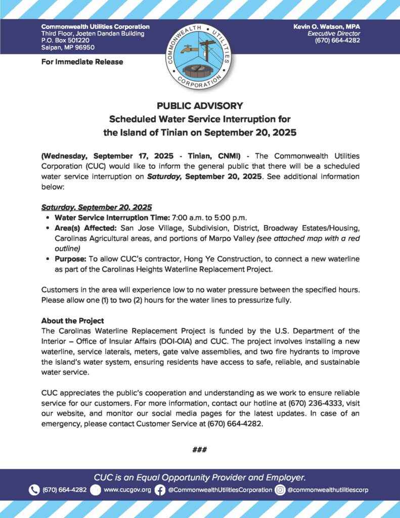 2025-09-17 Public Advisory re Scheduled Water Service Interruption for the Island of Tinian on September 20, 2025