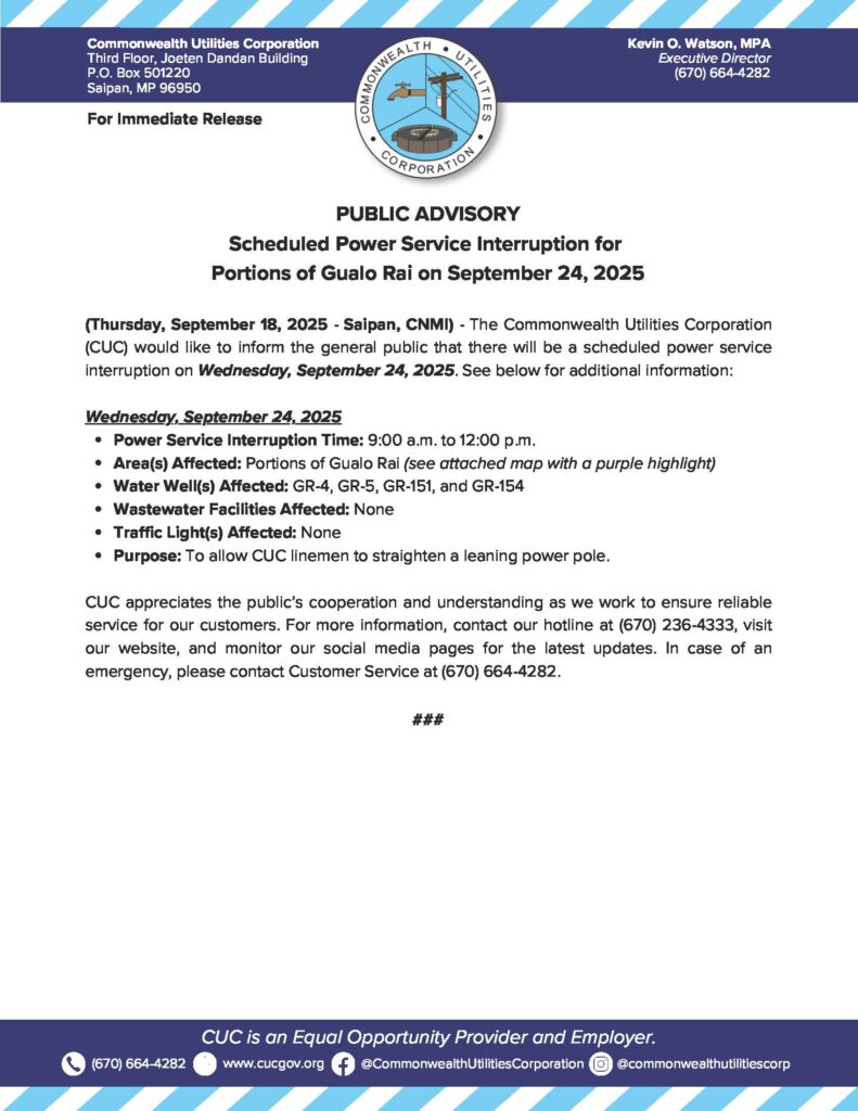 2025-09-18 Public Advisory re Scheduled Power Service Interruption for Portions of Gualo Rai on September 24, 2025