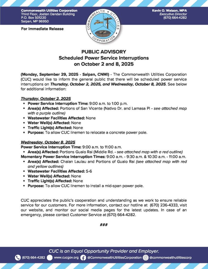 Home » News and Events » Public Advisories » 2025-09-29 Public Advisory re Scheduled Power Service Interruptions on Oct. 2 & 8, 2025