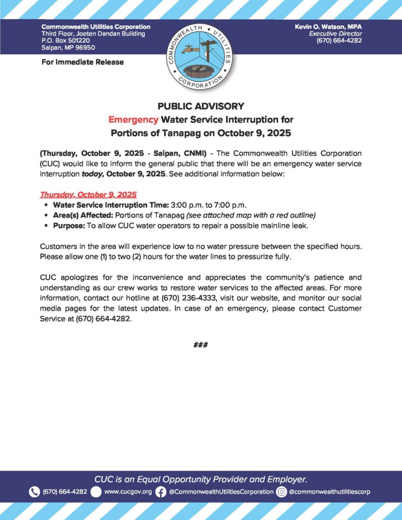 2025-10-09 Public Advisory re Emergency Water Service Interruption for Portions of Tanapag Today, October 9, 2025