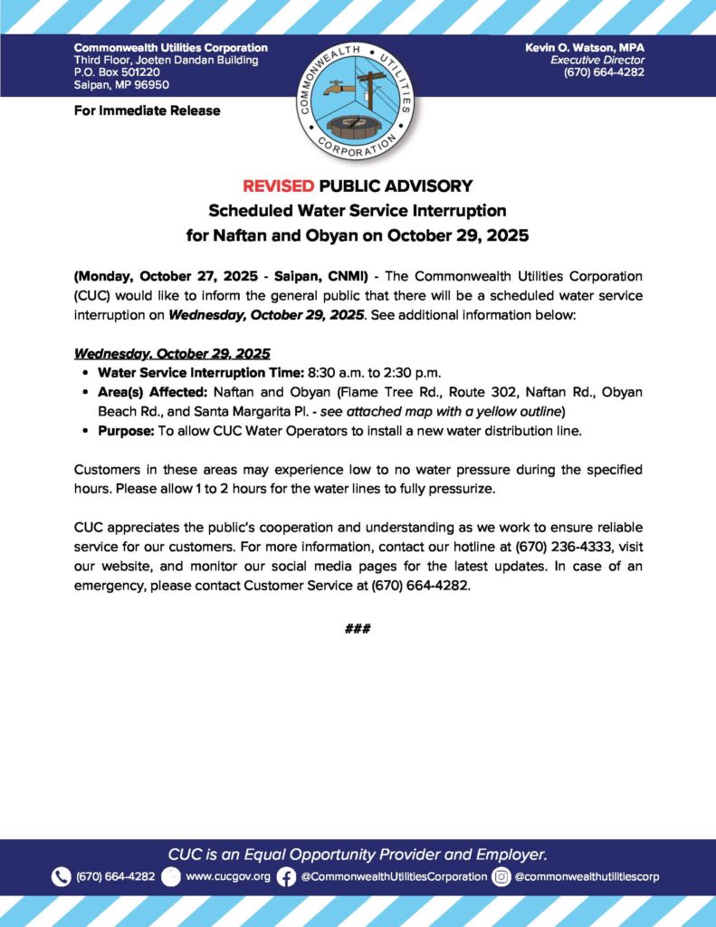 2025-10-27 Revised Public Advisory re Scheduled Water Service Interruption for Naftan and Obyan on October 29, 2025